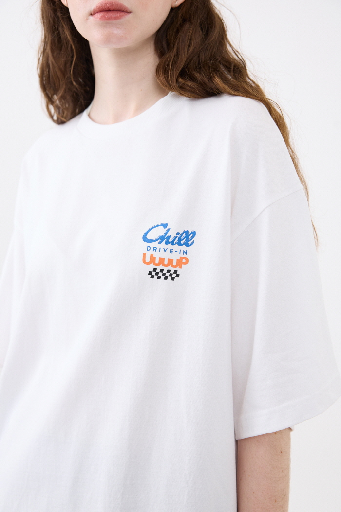 면 100% 소재로 제작된 CHILL DRIVE-IN 로고 그래픽 티셔츠입니다.
